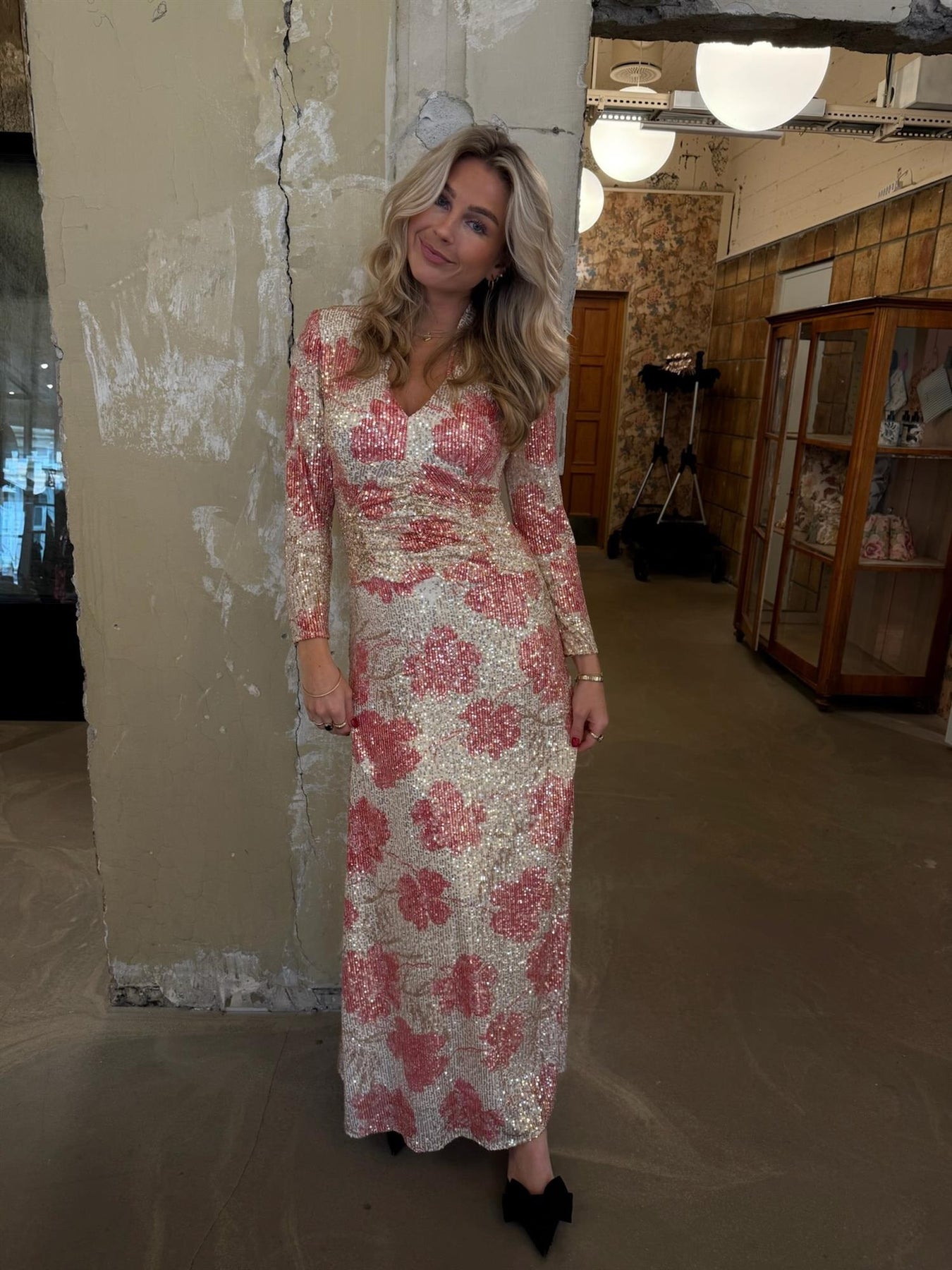 Et blomsterprint i bunnen gir kjolen et unikt og feminint uttrykk, mens den diskrete glidelåsen i siden sørger for en perfekt passform. Dette er den ultimate paljettkjolen til alt fra julebord og nyttårsfest til bryllup eller andre spesielle anledninger der du vil glitre litt ekstra.
