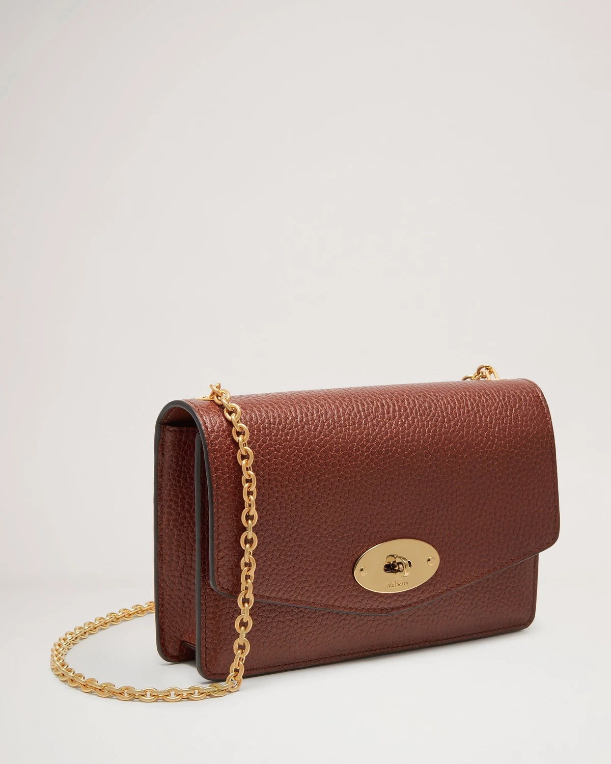 Small Darley Oak SCG fra Mulberry er en klassisk veske med konvoluttfasong som fremhever den klassiske Postman’s Lock-låsen. Den avtagbare kjederemmen gjør den allsidig i bruk – bær den crossbody, over skulderen eller som clutch. Innvendig er den smart organisert med kortlommer og lommer for småting; på utsiden finner du en glidelåslomme med kile for litt ekstra plass.