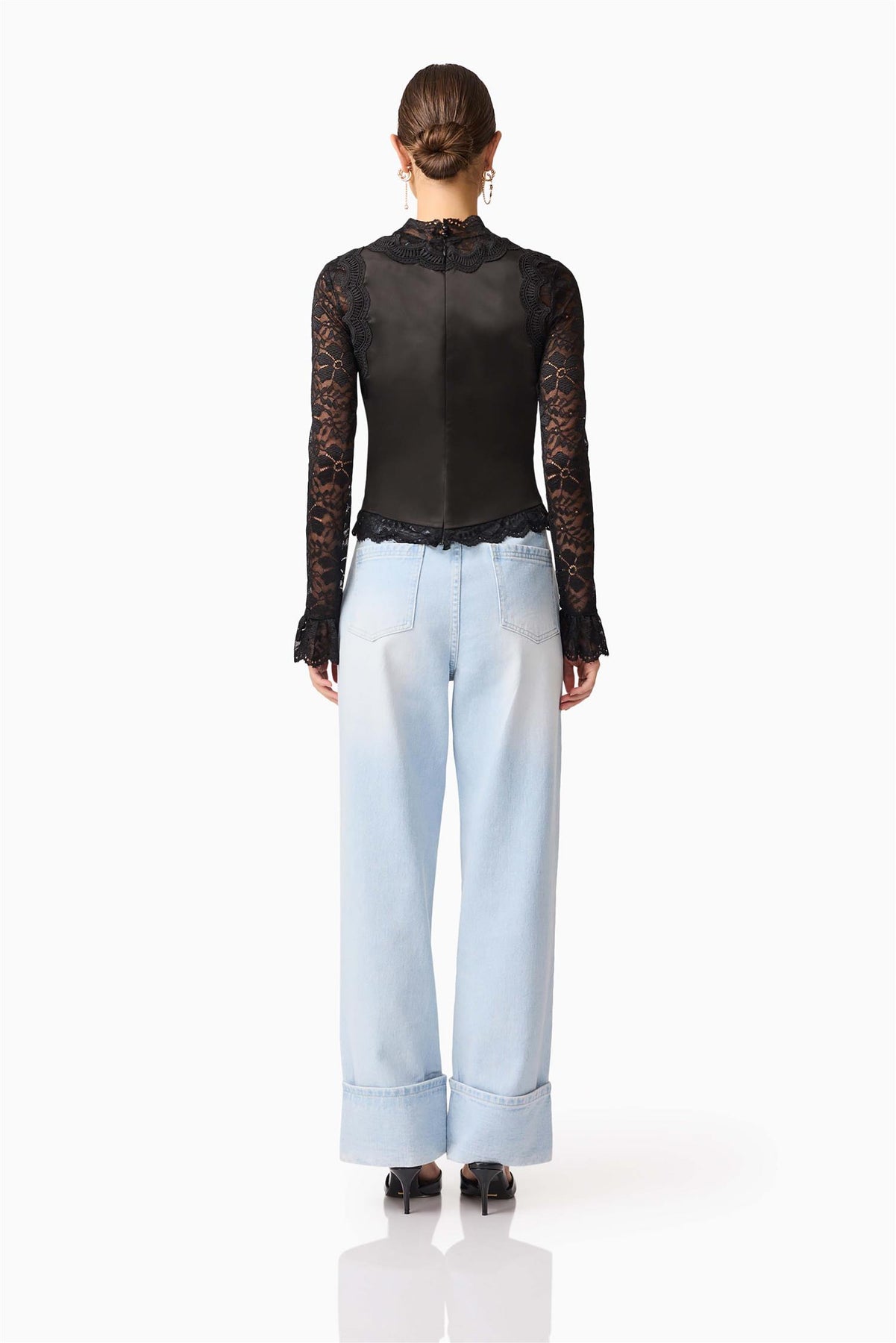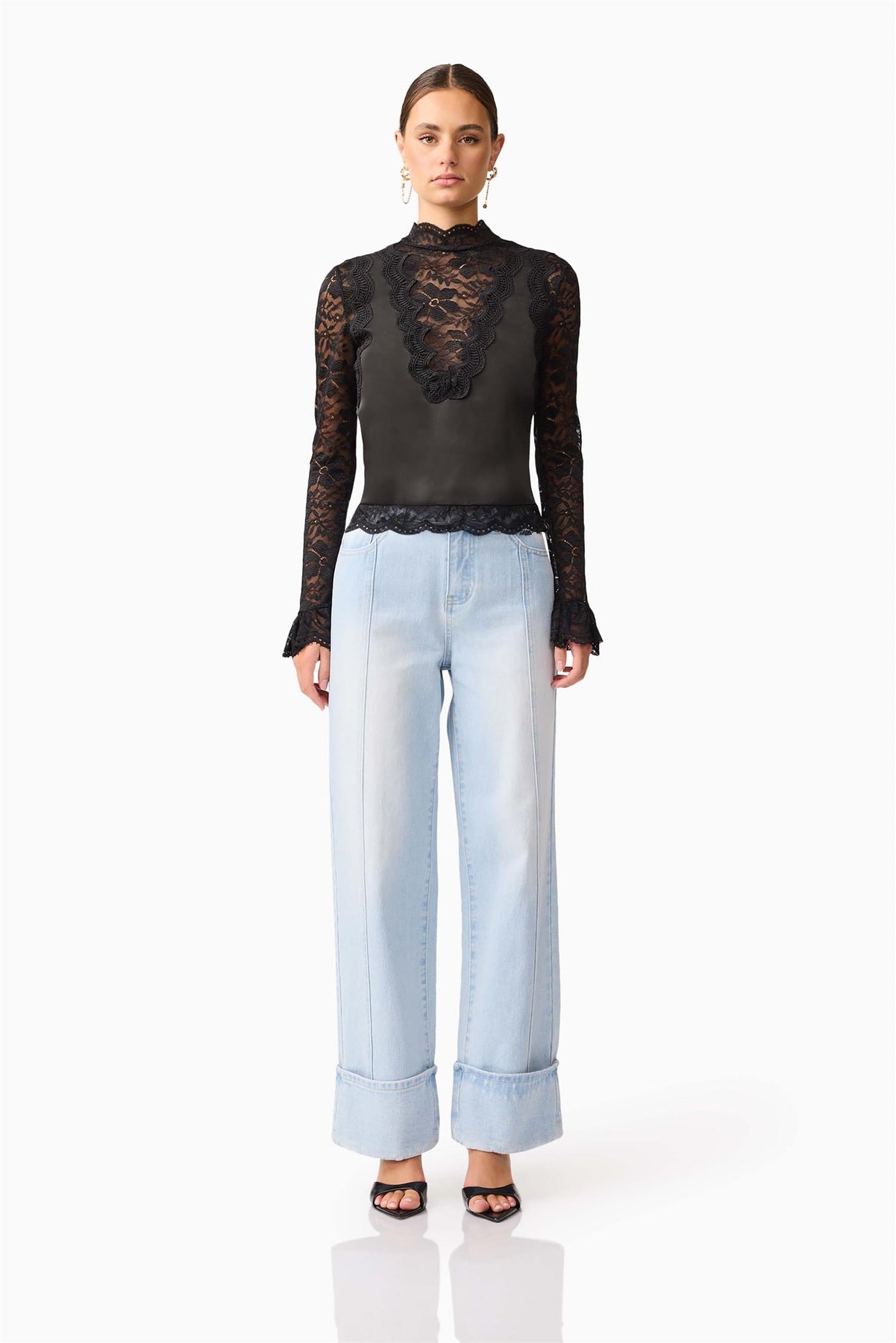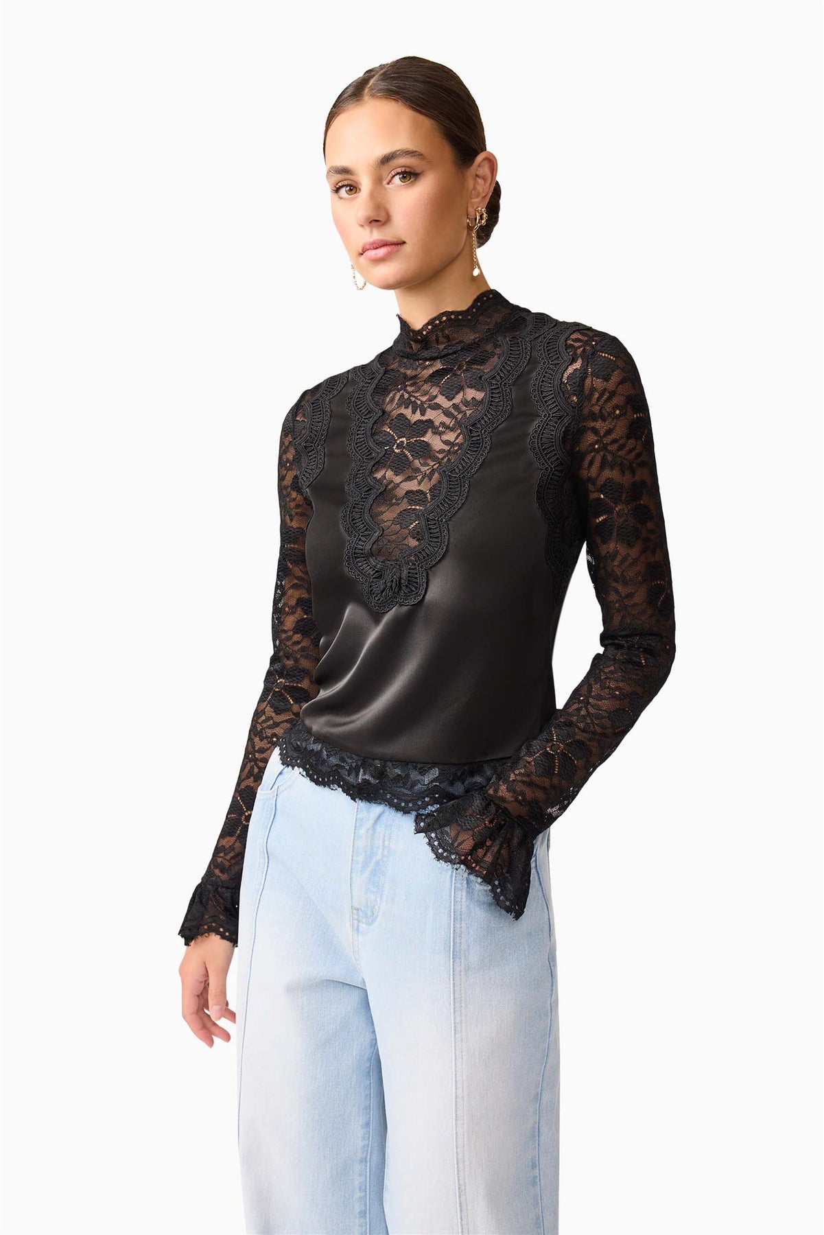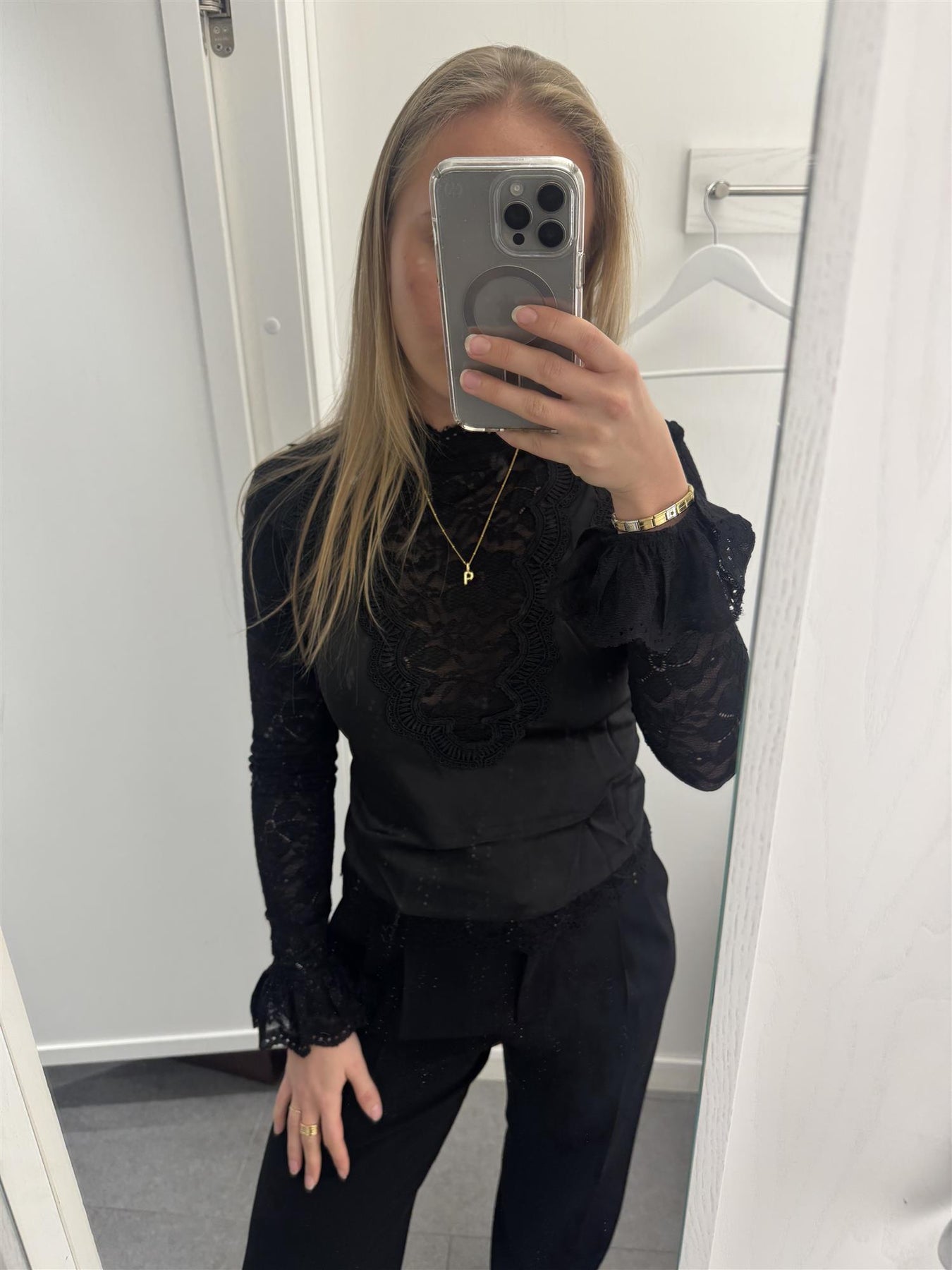 Denne toppen kombinerer tidløs svart farge med delikate blondedetaljer som gir et feminint og elegant uttrykk. Blondene pryder utringningen, ermene og nederkanten, og skaper et lekent og luksuriøst preg.