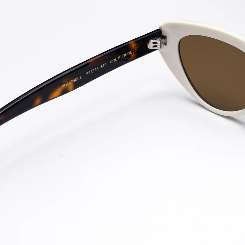 Phoenix Blonde fra Frank Walton. Phoenix er en elegant acetat-solbrille med et tidløst design. Skill deg ut med denne versjonen som er hvit i front og brun melert på siden.