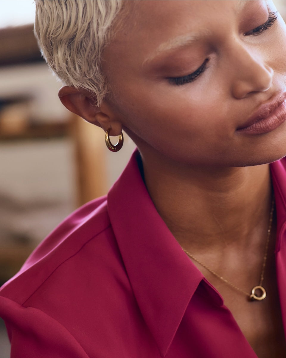 Furo hoops er, med sin elegante form og enkelhet, perfekte øredobber som kan brukes til alle anledninger. Furo creoler L er et must i smykkegarderoben og vises her i blankt 14K gullbelegg. Navnet Furo betyr kjernen av strømmen på japansk.