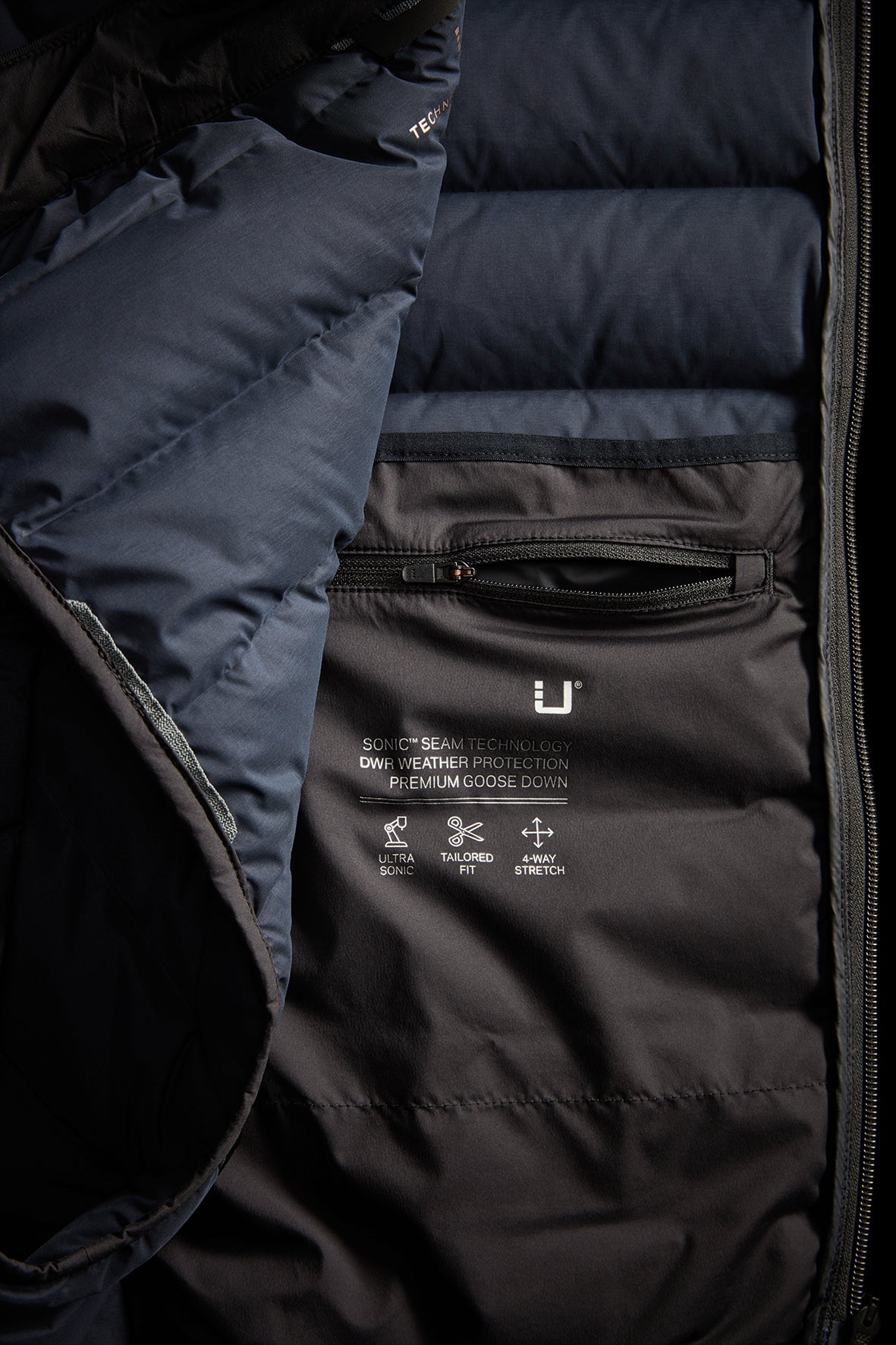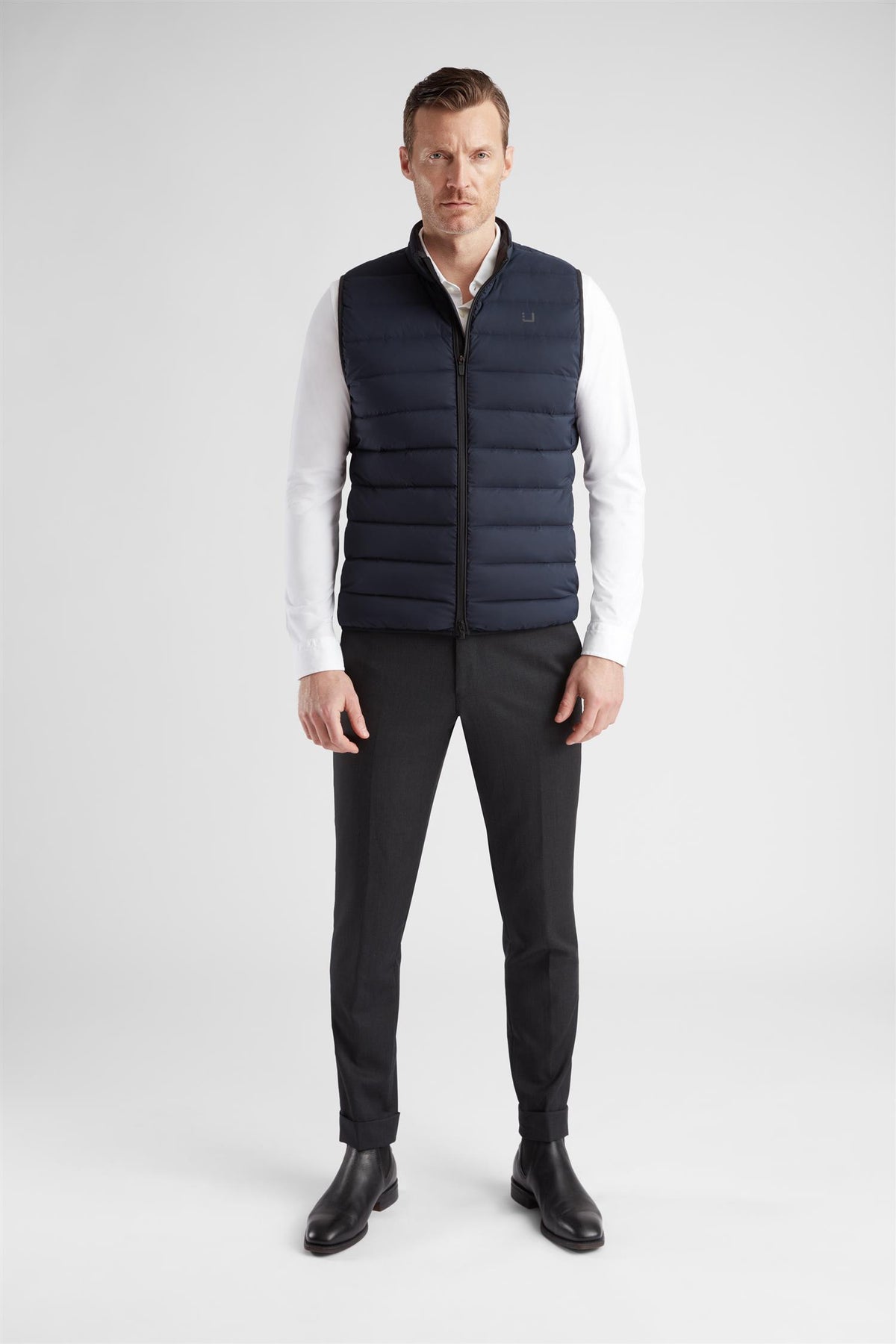 Lett dunvest fra norske UBR, foret med 800-fill power gåsedun. Modellen er ikke bare superlett med sine totalt 330 gram, men full i stretch, pustende og vannavvisende. Vesten kommer med to ytterlommer og lukkes med to-veis glidelås i front. Passer perfekt under en blazer eller regnjakke, men også aleine til jeans eller chinos. Lengen når ca ned til livet. Moderat slim passform, kan oppleves som noe liten i størrelsen. Modellen er 188cm og bruker størrelse Large.