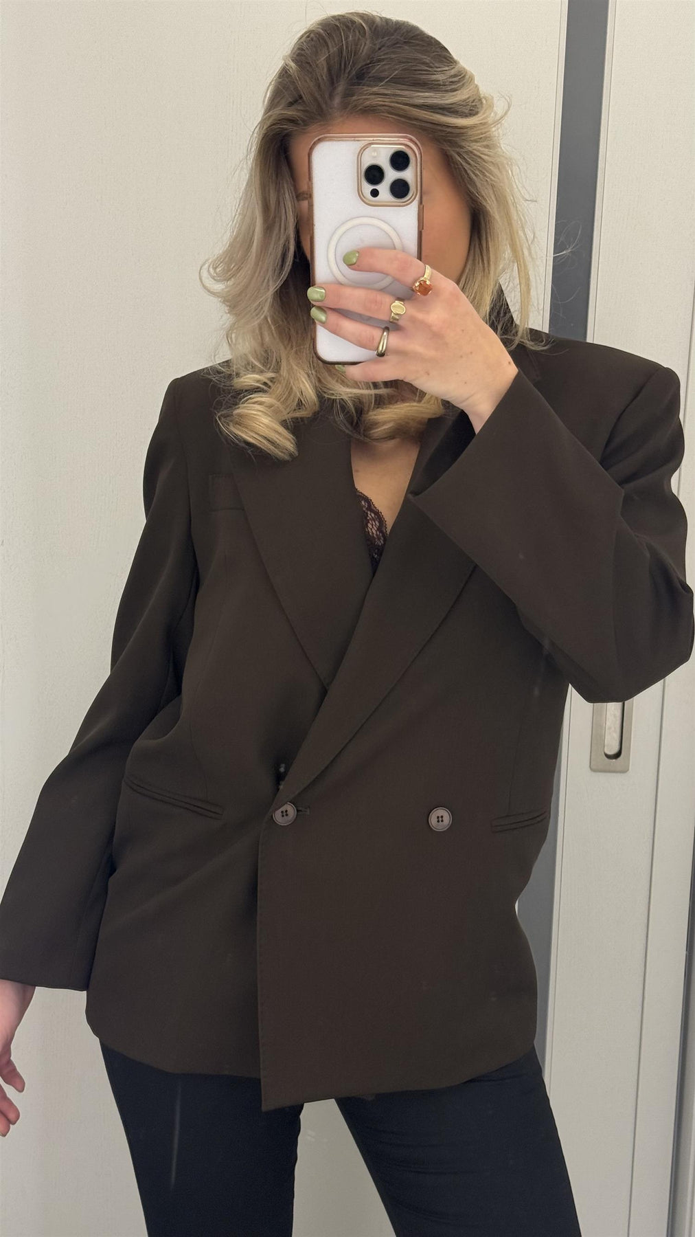 En nydelig dobbeltspent blazer i mørk brun med en rett fasong.